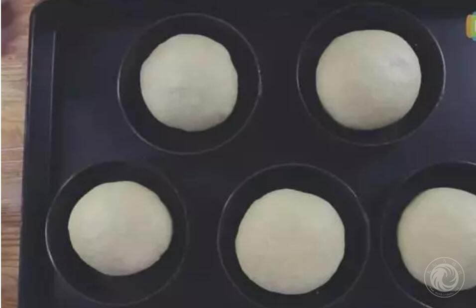 5.把醒发好的面团分割成350g/个,溜圆,放在模具中间,送入醒发箱以湿度80%、温度37℃醒发30-40分钟,发至原体积的2倍大小。
