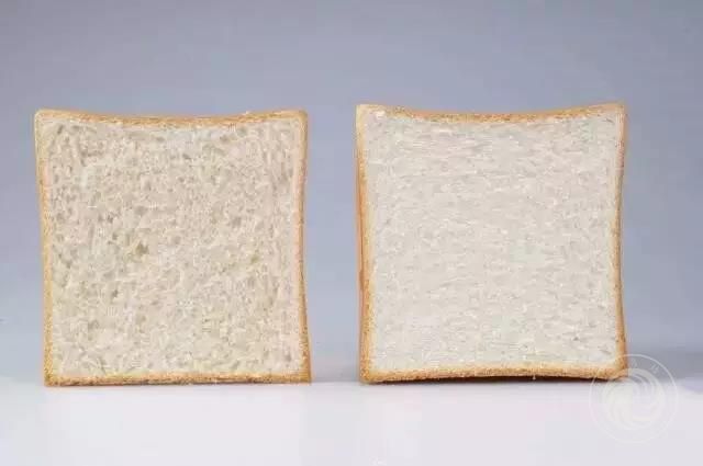 (同样的做法,左边是家庭自制面包,右边为加了改良剂的面包)